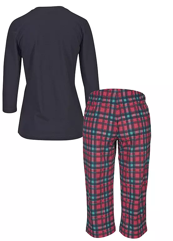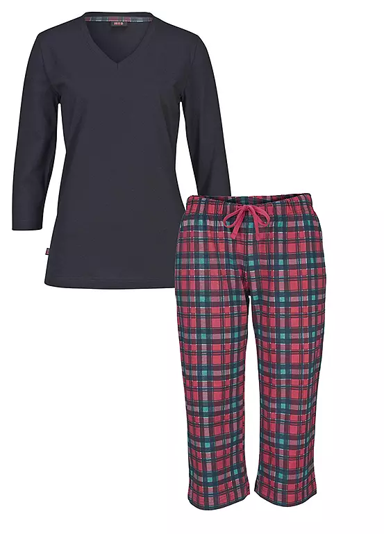 These pretty and playful capri style pyjamas have three-quarter length sleeves, a v-neck and logo print on the chest. Featuring checked cropped trousers with an elasticated waistband for a comfortable fit they are perfect for chilling out whilst still looking stylish and cute.