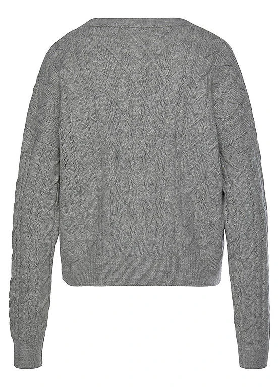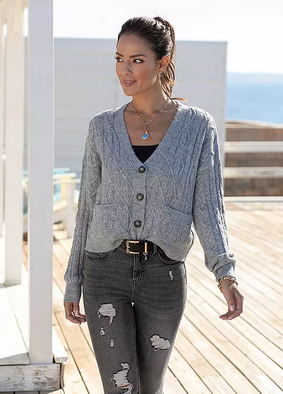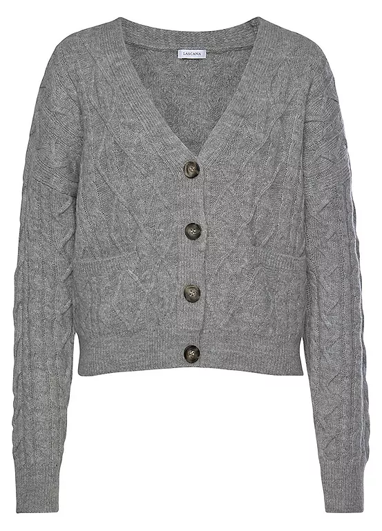 Trendy knit cardigan in a slight cropped fit with a button placket and small patch pockets. Comfortable knit quality.