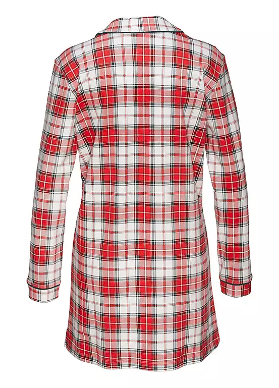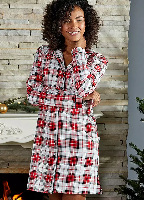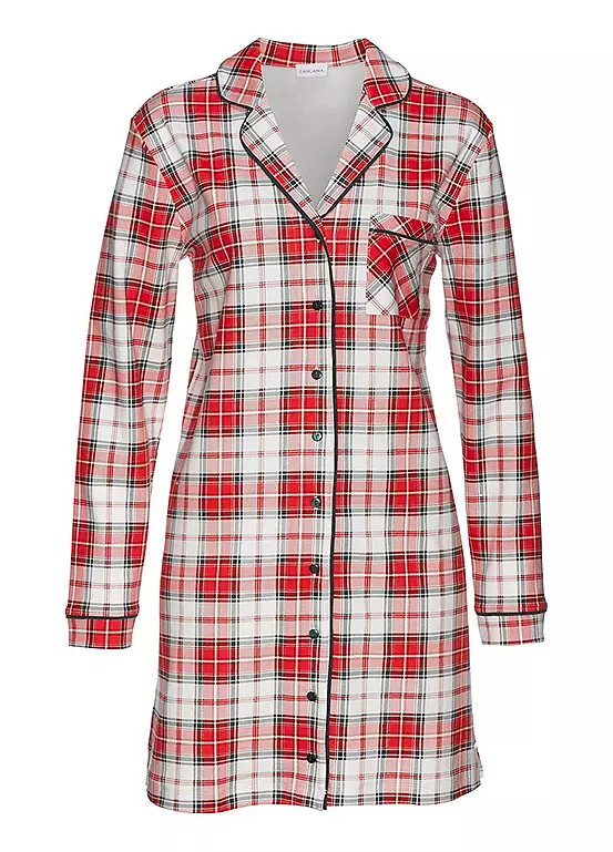 Not just for special occasions. With the festive nightgown, you get a stylish piece of clothing for the night. What first catches the eye is the tasteful checked print, which is complemented by contrasting piping. There are more details to discover! The lapel collar with its continuous button placket perfectly matches the atmospheric design. The chest pocket sets its accent. Holidays, weekends or cosy winter evenings on the couch, are made for the oversize shirt. Just feel great in the nightgown and enjoy the soft cotton quality on your skin. Festive plaid nightgown with piping. Lapel collar with continuous button placket. Patch chest pocket. Pleasantly soft cotton quality.