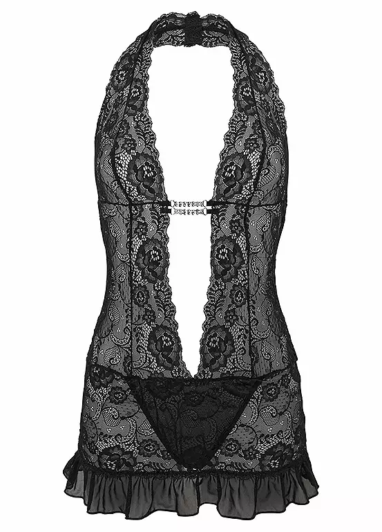 Dial up the drama after dark with this revealing halterneck bodice. The sexy low-cut neckline is made entirely from a figure-hugging stretch lace which swoops down over the breasts leaving the navel on show. The hem is wrapped with frills for a perfect finish. I’ll let you in on a little secret, this style comes with an opening at the crotch.