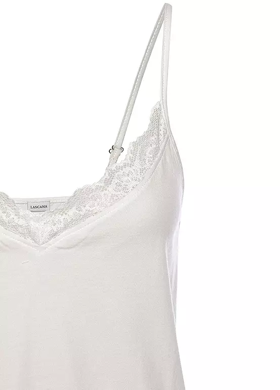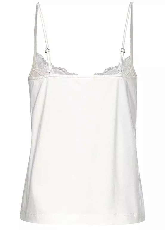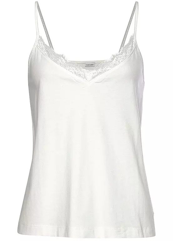 Simple, feminine and wonderfully comfortable, this strappy top features a delicate lace trim at the V-neckline. Made from a soft cotton blend with adjustable straps. Strappy top with lace inserts at the V-neckline. With adjustable straps.