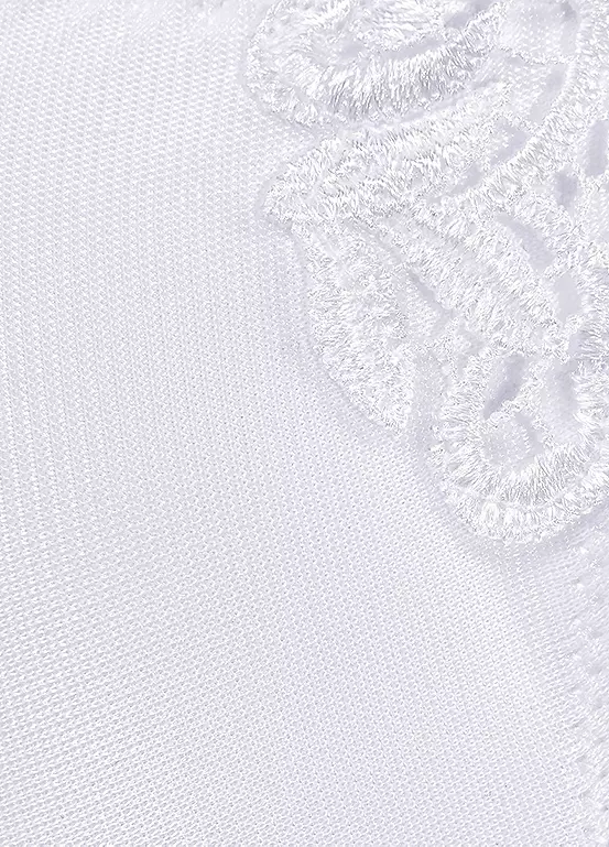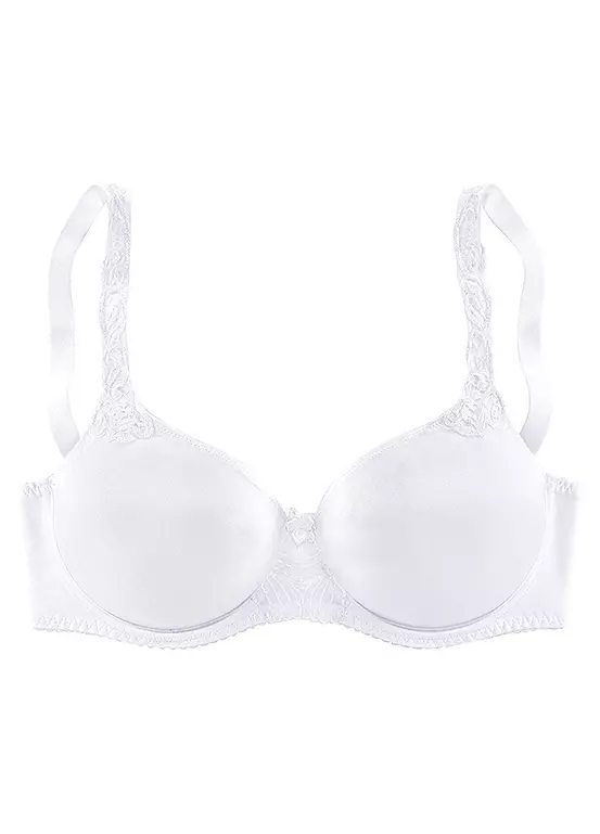 Feminine minimiser bra with seamless, unlined cups and underwire for a natural shape. Features fine decorative bow with small glitter accessory in the front centre, and straps decorated with subtle embroidery lace. Individually adjustable straps and back closure for a personalized fit. Created with love and passion in Hamburg, this minimiser bra is perfect for all-day comfort and support. Fine decorative bow with small glitter accessory in the front centre. Straps decorated with subtle embroidery lace. Created with love & passion in Hamburg. With underwire, with pretty embroidery on the straps. Hand wash. 83% Polyamide, 12% Elastane, 5% Polyester.