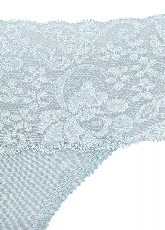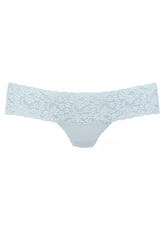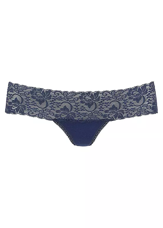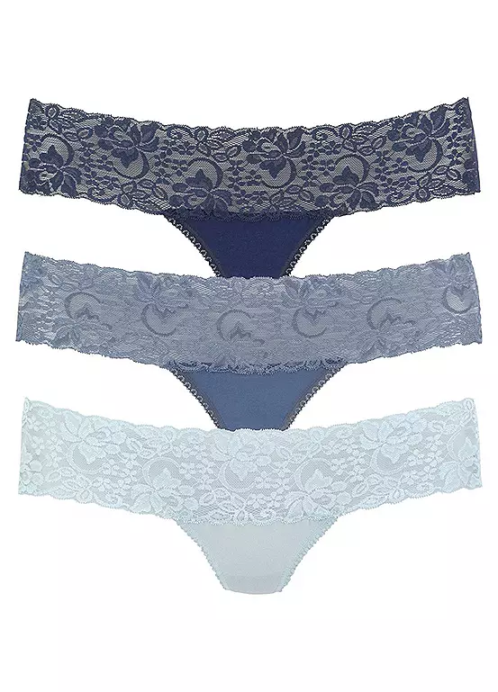 Comfortable pack of 3 thongs with a wide lace band. Pack of 3. Wide, elasticated lace waistband. Soft edging at the leg opening. Pack of 3. Wide, elasticated lace waistband. Soft edging at the leg opening. Comfortable stretch cotton. Machine washable. Shell: 95% Cotton, 5% Elastane. Lace: 93% Polyamide, 7% Elastane.