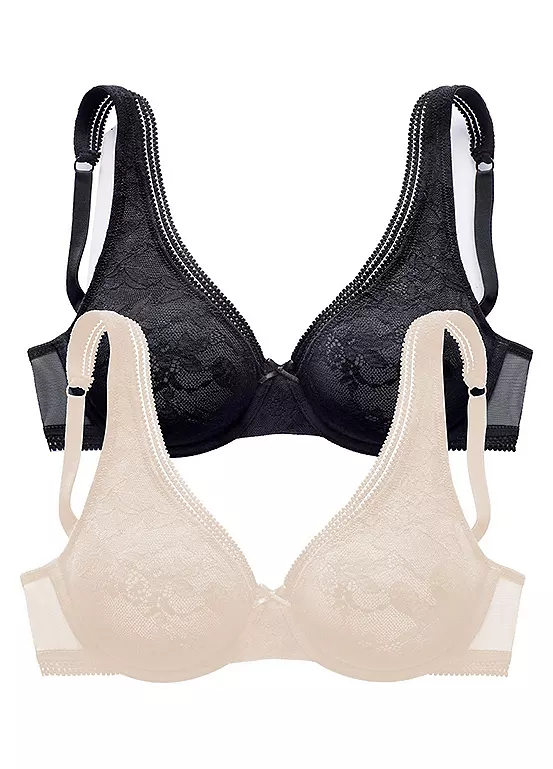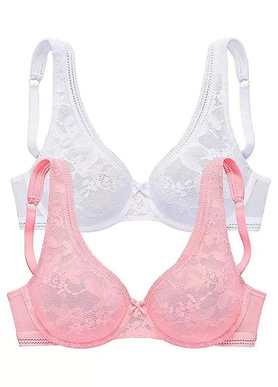 This pack of 2 underwired t-shirt bras is a must-have for any wardrobe. Featuring seamless pre-formed cups without padding, delicate lace in a floral design, and a playful decorative bow at the centre front, these bras are both functional and stylish. The adjustable straps and back closure ensure a comfortable fit, while the affordable double pack makes it a great value. Say goodbye to uncomfortable bras and hello to this non-padded, underwired t-shirt bra. Pack of 2.