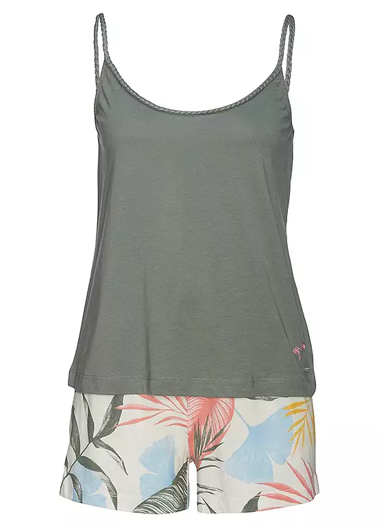 Shorty pyjama set consists of a single colour sleeveless top with plaited braid details as straps and a subtle embroidery that is located on the side above the hem. Patterned shorts with an elastic drawstring waist serve as bottoms. Soft single jersey fabric made from a high-quality cotton-viscose mix.